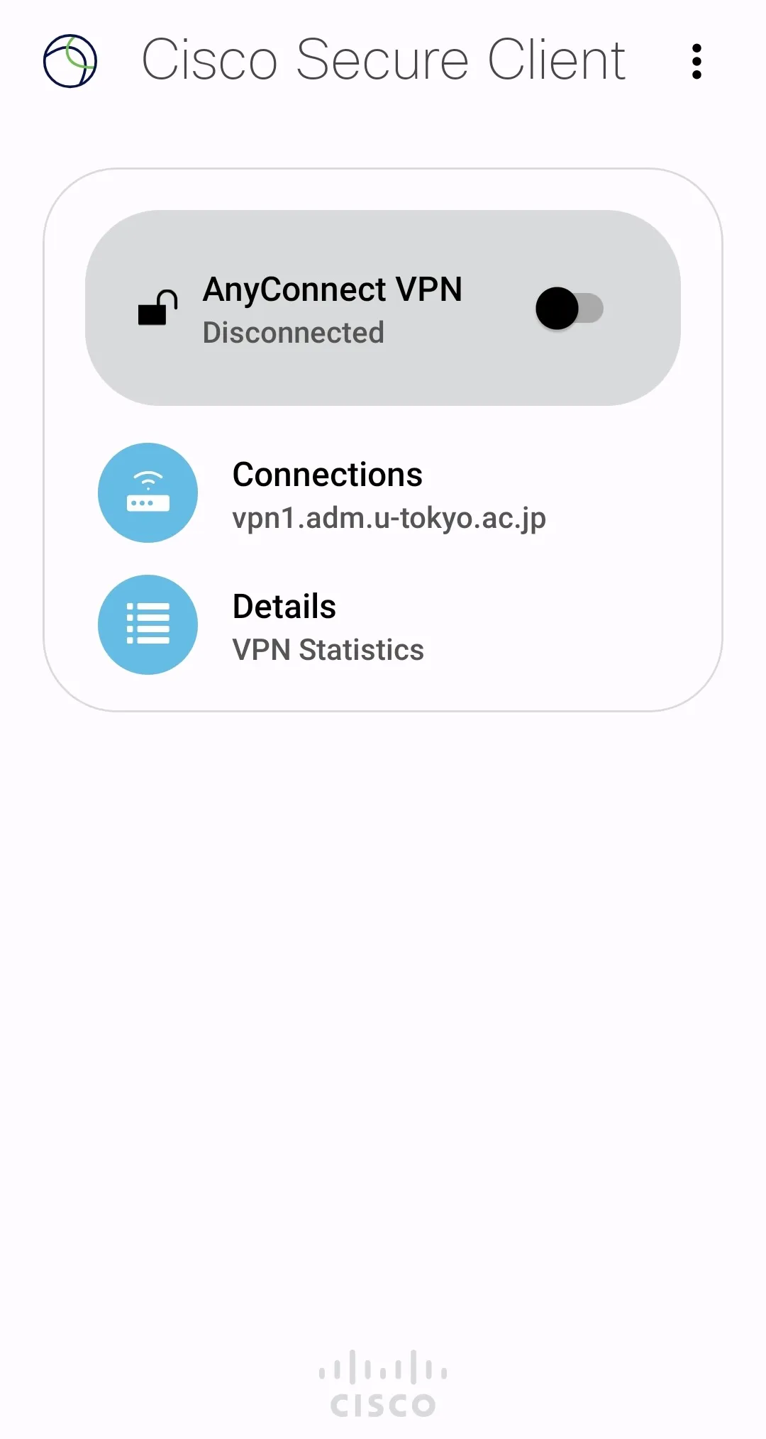 Step G: Your device is connected to the UTokyo VPN if “Connected” is displayed on the Secure Client app screen as shown below.