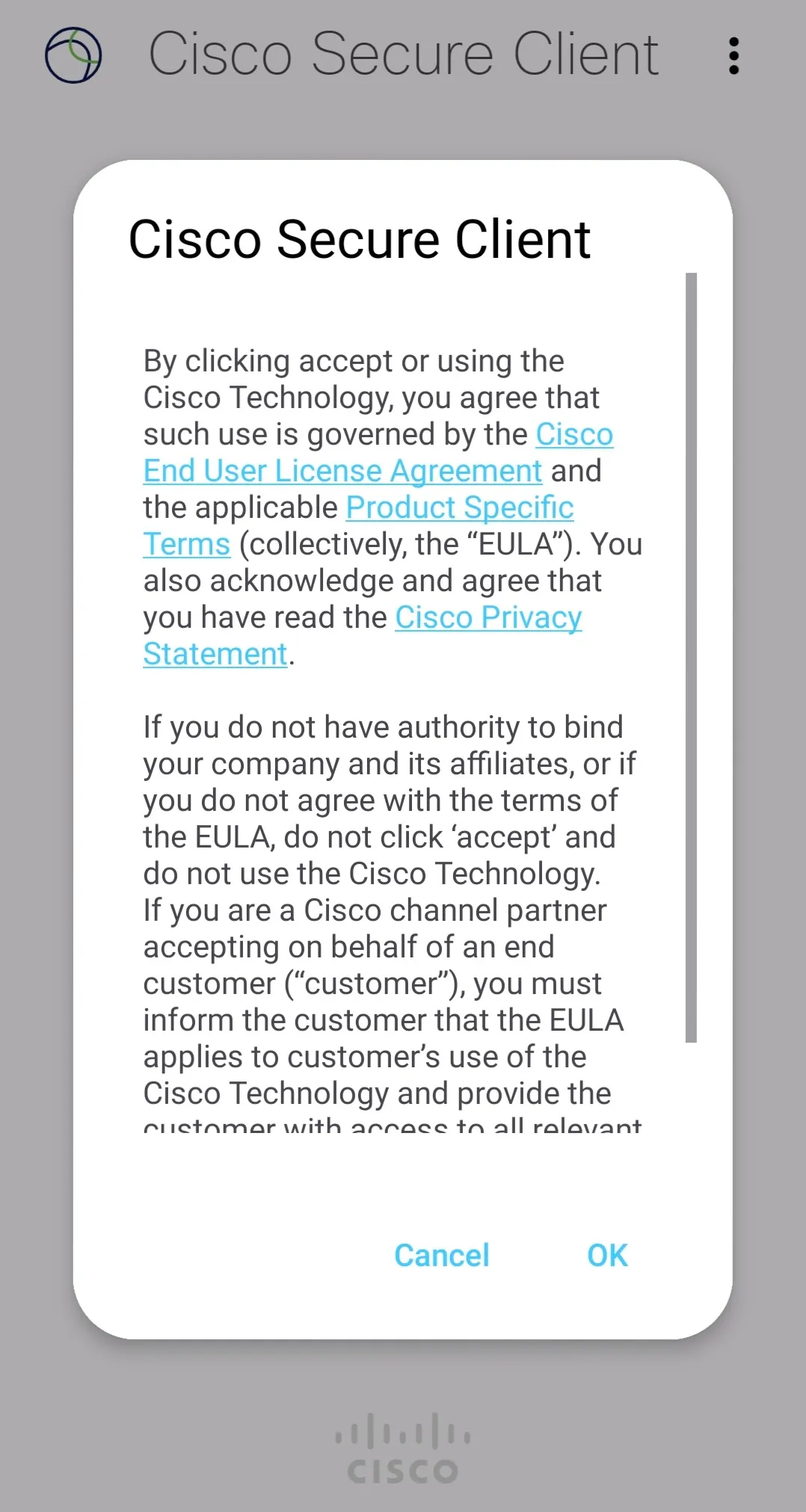 Step B: After installation, open the Secure Client app and check if the screen shown in the first image below is displayed. Confirm the contents and tap “OK”. If the screen shown in the second image below is displayed, the installation is complete.