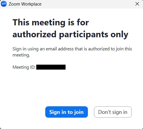 - You may see a screen that states “This meeting is for authorized participants only”. If this screen appears, click “Sign in to join” and sign in to Zoom with your UTokyo Account. For sign-in instructions, refer to “Sign-in Methods for Zoom”.