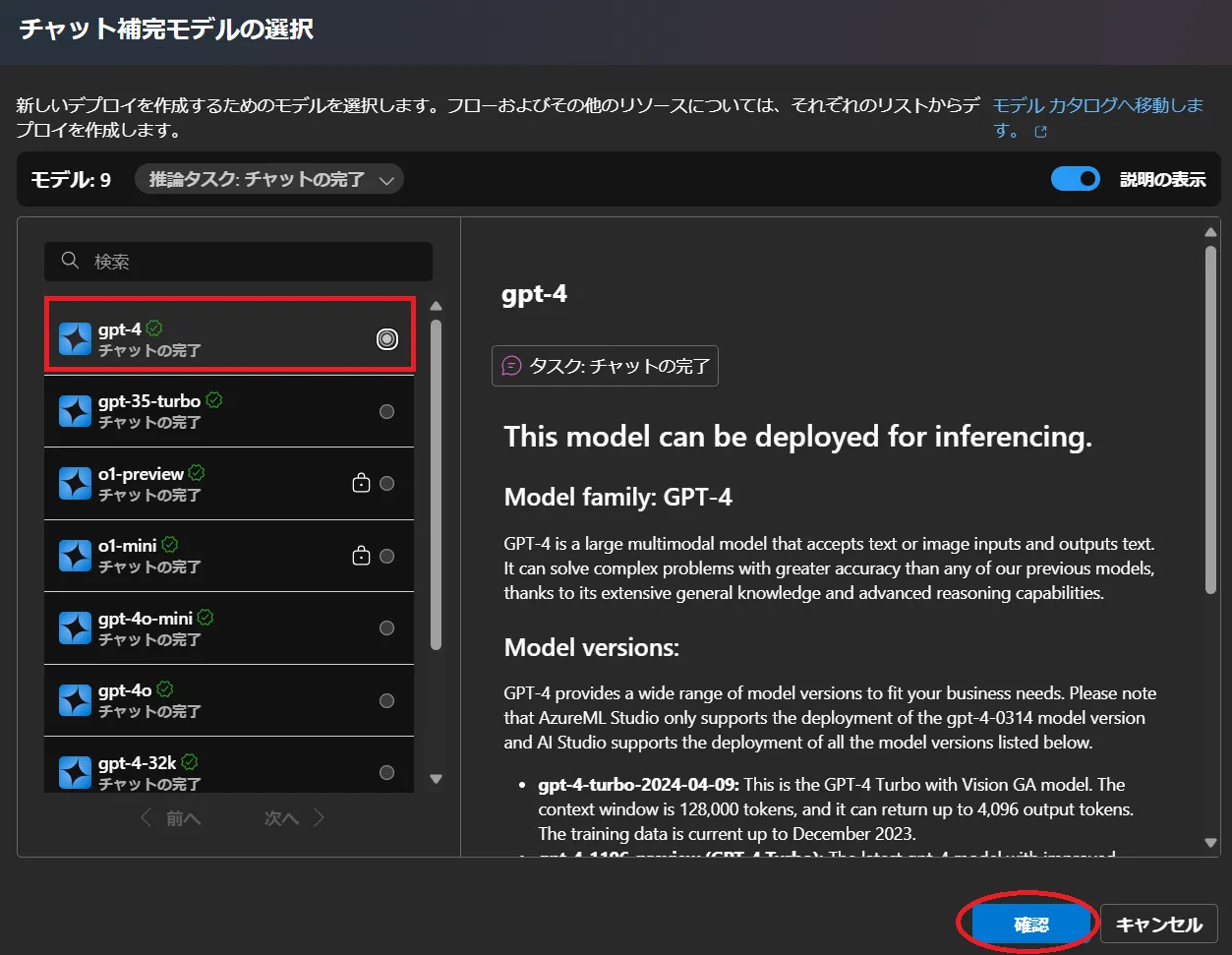 gpt-4を選択し,右下にある確認をクリックしてください.