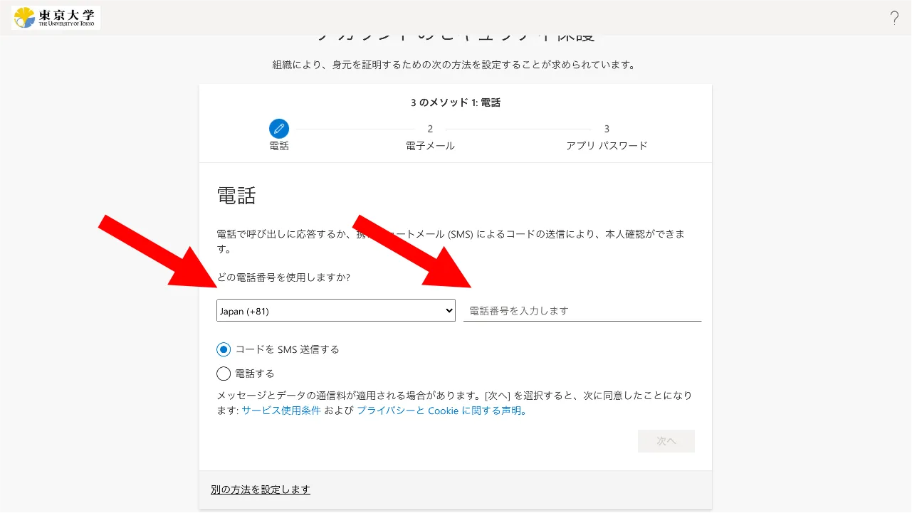 - 電話番号でSMSを使う場合:SMSにコード(6桁の数字)が送られ,それを入力するように求められるので,そのようにしてください.