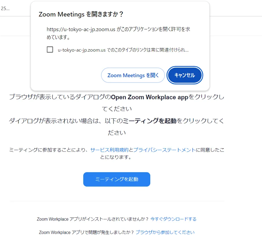 • Zoomアプリがインストールされていない場合は,「Zoom Meetingsを開きますか?」のダイアログは表示されません.アプリを使わずにZoomミーティングに参加する方法は,「ブラウザでの操作」のセクションで詳しく後述します.