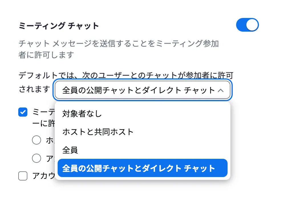 自身がホストであるミーティングで,自身や参加者がチャットを使うためには,チャット機能が有効化されている必要があります.またこのとき,チャットを有効化する対象を設定することもできます.なお,デフォルトの設定ではチャット機能は有効化されています.